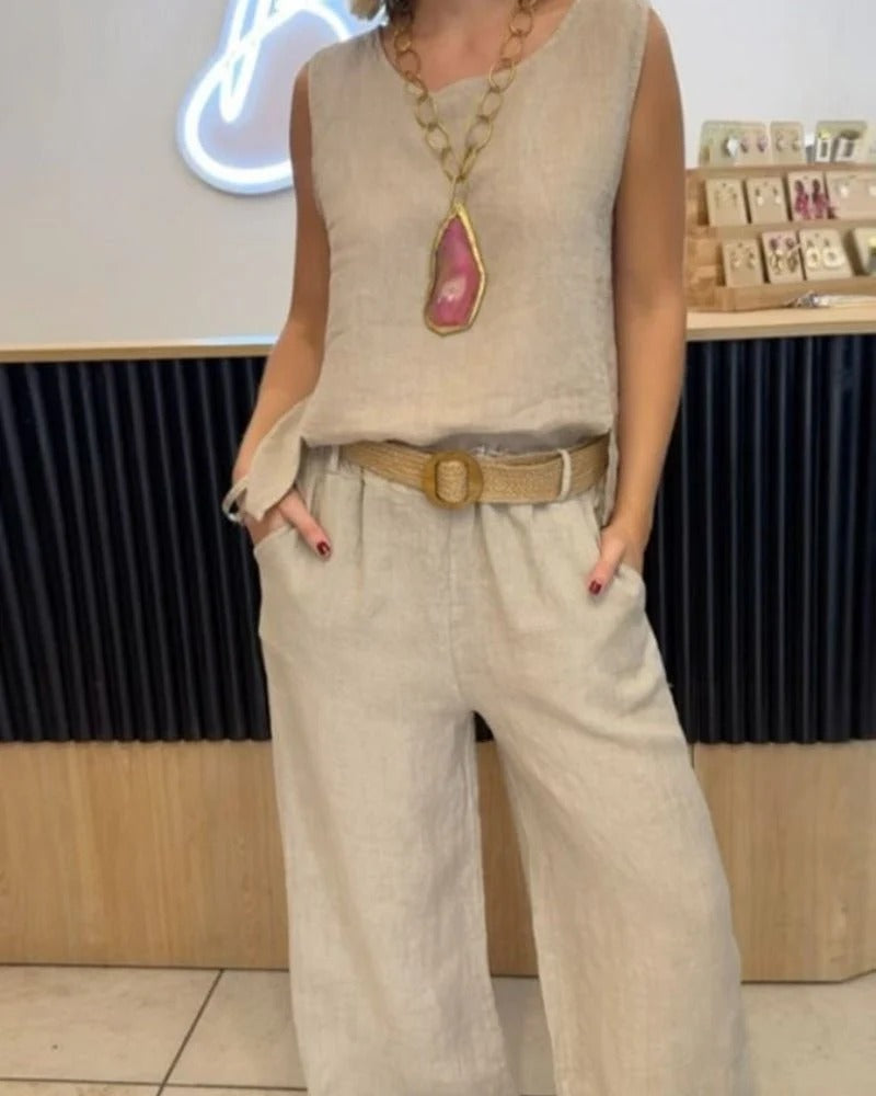 Este conjunto de dos piezas es la definición de elegancia desenfadada y frescura natural. Diseñado para brindar máxima comodidad sin sacrificar el estilo, combina un top sin mangas de corte recto con un pantalón de pierna ancha que aporta fluidez y libertad de movimiento. Perfecto para días de calor, vacaciones o un look casual chic de día. Ideal para combinar con accesorios llamativos, sandalias planas o incluso tacones bajos.